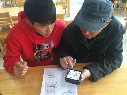拿到志愿者冒雨送来的说明书后,李大爷连声感谢:“这些大学生志愿者关爱我们老年人,想我们之所想,急我们之所急,非常给力,非常贴心。有了说明书,我再也不用担心微信的操作了!”图为志愿者李忙忙教李大爷使用微信。(李梦莹)