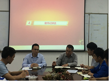 学生第四党支部10月24日下午在东七-609会议室开展党日活动,院党委副书记谢慧荣、学工办主任刘兴权、党支部书记王相如及17级所有党员参加活动。全体党员肃立高唱国歌,交纳当月党费,重温入党誓词,王相如老师带领全体党员学习了习近平总书记“不忘初心,牢记使命”主题教育工作会议上讲话原文。谢书记向全体党员提出“两味”期望,他强调:全体党员既要有选好书、读好书的“书香味”,也要有深入寝室和班级践行党的宗旨的“泥土味”;要勤学苦练担责任,精进深耕守初心。刘老师要求支委会全体委员明确责任,勇挑重担,扎实做好培养教育引领青年学生的工作,把主题教育活动扎实推进。