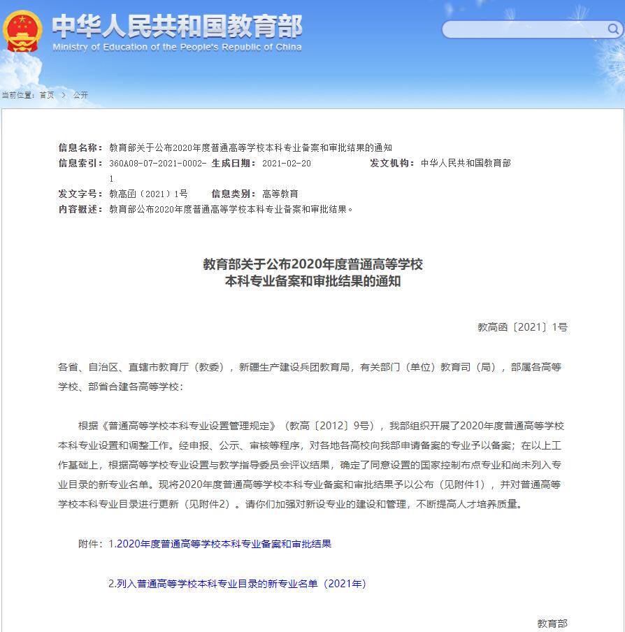 近日,教育部下发《教育部关于公布2020年度普通高等学校本科专业备案和审批结果的通知》(教高函〔2021〕1号),太阳成官网新增人工智能本科专业,该专业今年将列入招生计划。