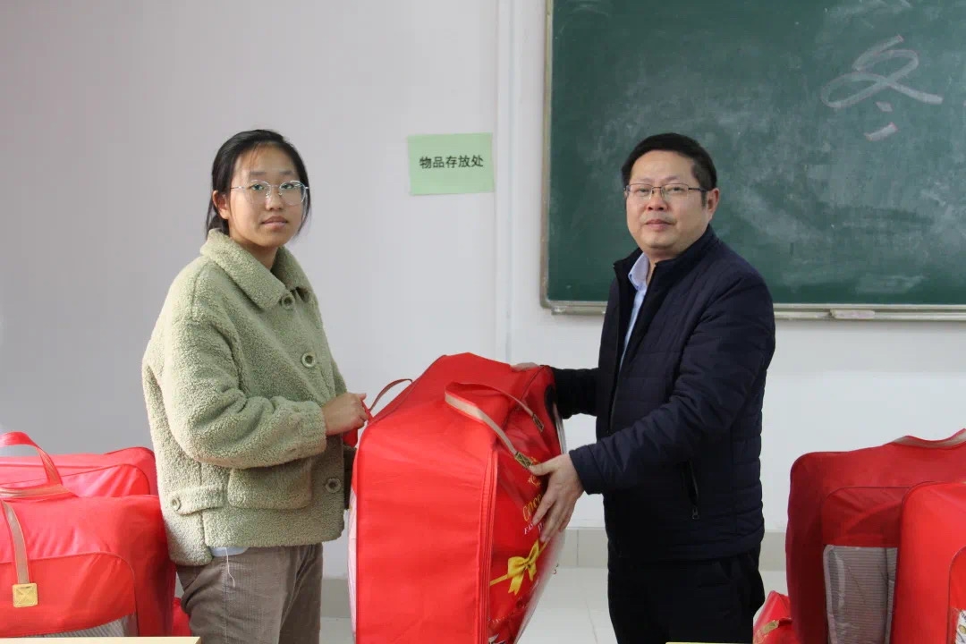 活动中,孟三爱为2021级受助学生代表赠送了冬被,并合影。