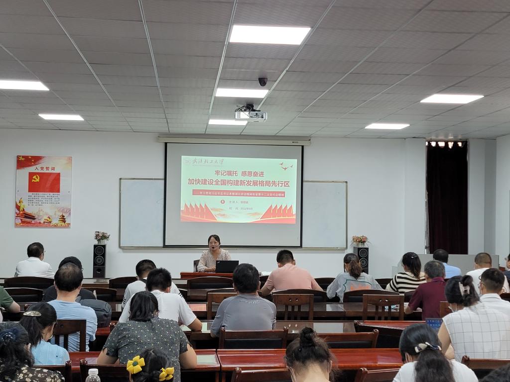 侯德娟博士以《牢记嘱托 感恩奋进 加快建设全国构建新发展格局先行区》为题,全面阐述了习近平总书记考察湖北重要讲话精神的核心要义和精神实质,深入剖析了省第十二次党代会报告的思维框架和内在逻辑。宣讲紧扣省情、校情,主旨清晰、内容丰富,既有理论上的深刻感悟,也有实践中的升华提炼,对全体教职工进一步准确把握习近平总书记考察湖北重要讲话精神和省第十二次党代会精神,凝聚力量推动学院高质量发展具有重要指导作用。