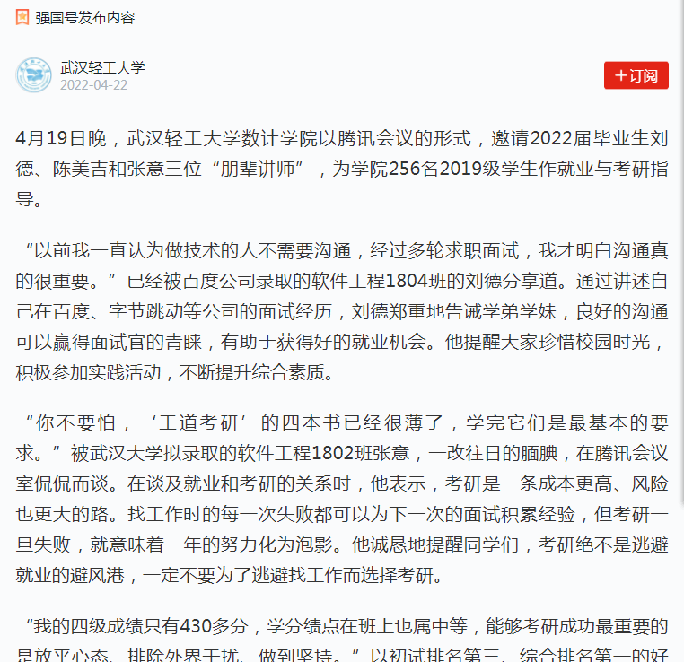 4月19日晚,太阳成tyc9728集团数计学院以腾讯会议的形式,邀请2022届毕业生刘德、陈美吉和张意三位“朋辈讲师”,为学院256名2019级学生作就业与考研指导。