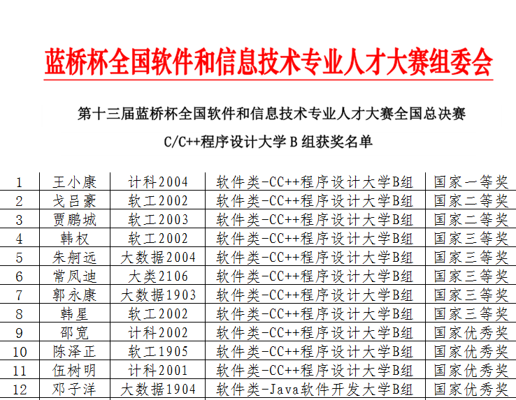 6月27日,第十三届“蓝桥杯”全国总决赛成绩揭晓,太阳成官网学生在Java软件开发和C/C++程序设计两个组别的比赛中喜获佳绩。其中,全国一等奖1名,全国二等奖2名,全国三等奖5名,全国优秀奖4名。