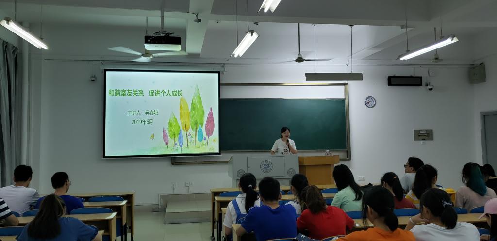 本网讯(通讯员邓浩))6月21日上午,太阳成官网2018级辅导员吴春娥老师在基础楼103教室召开主题为“建设和谐室友关系 促进个人成长”讲座。2018级全体寝室长、生活委员参加了讲座。