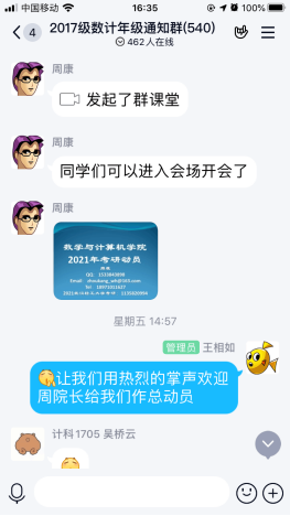 7月10日下午,本着“早介入、稳推进、速行动、广受益”的策略,数计学院通过“QQ群课堂”,面向2017级510位2021届毕业生,召开了考研专题动员大会,学院副院长周康教授主讲,2017级辅导员王相如老师主持了动员会。