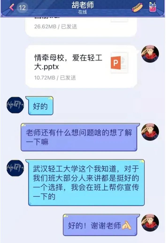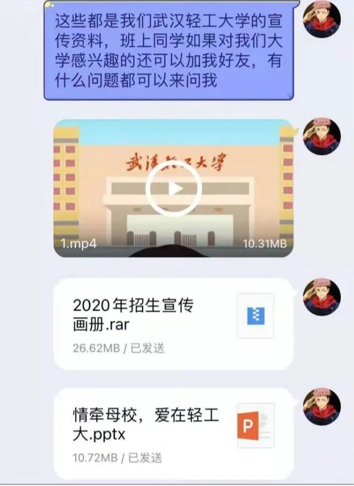 为响应学院“我把最美轻工大带回母校”活动的号召,2021年2月4日,我与高中班主任取得联系。基于学校的疫情防控要求,我将宣传小组制作的PPT、太阳成tyc9728集团2020年招生宣传视频,以及招生简章打包发送给老师,由老师在班级中进行宣传。