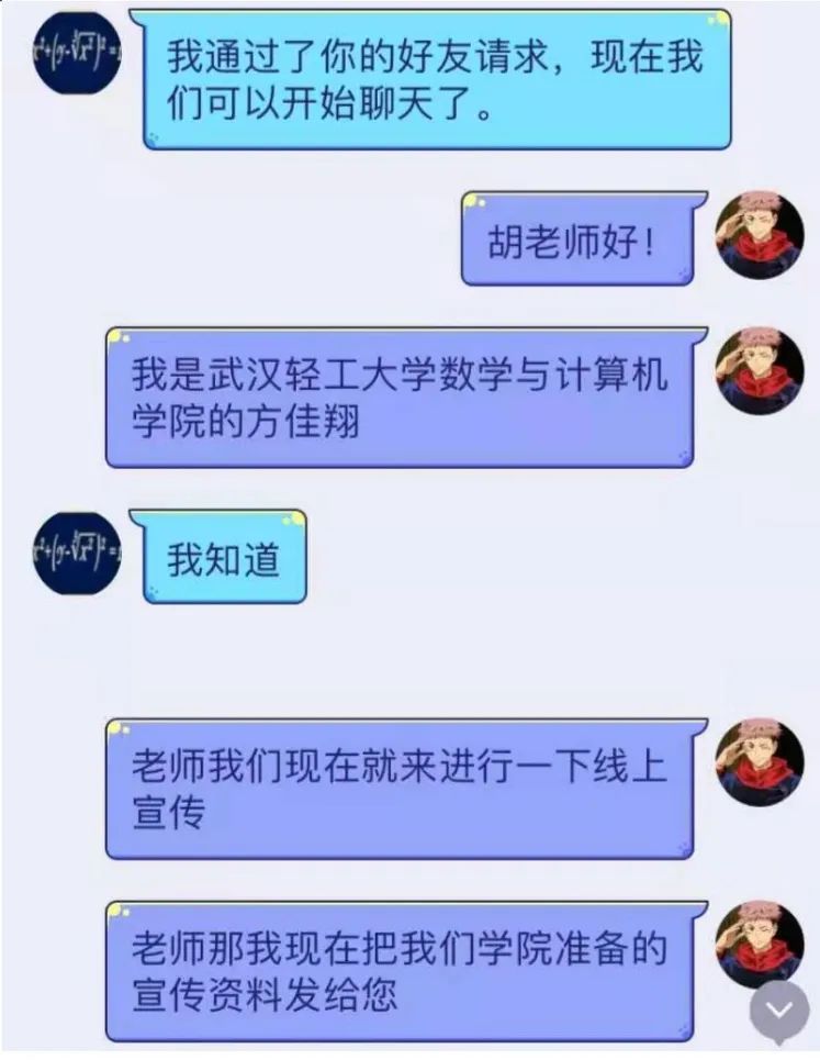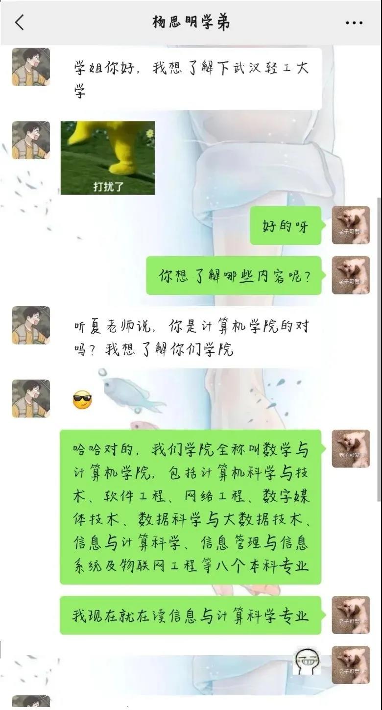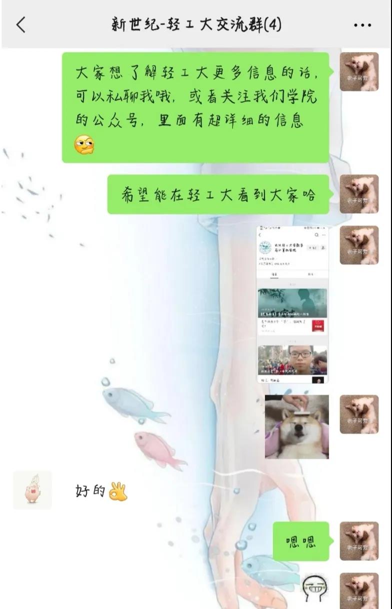老师向我推荐了三名有意向报考轻工大的学生。沟通过程中,我发现他们对轻工大并没有太多的了解。于是,在和他们介绍了学校特色、专业和环境后,我又向他们推荐了学院的微信公众号,并分享了一些在异地上学的经验。最后,学弟学妹们表示一定会努力学习,争取明年能够进入轻工大。