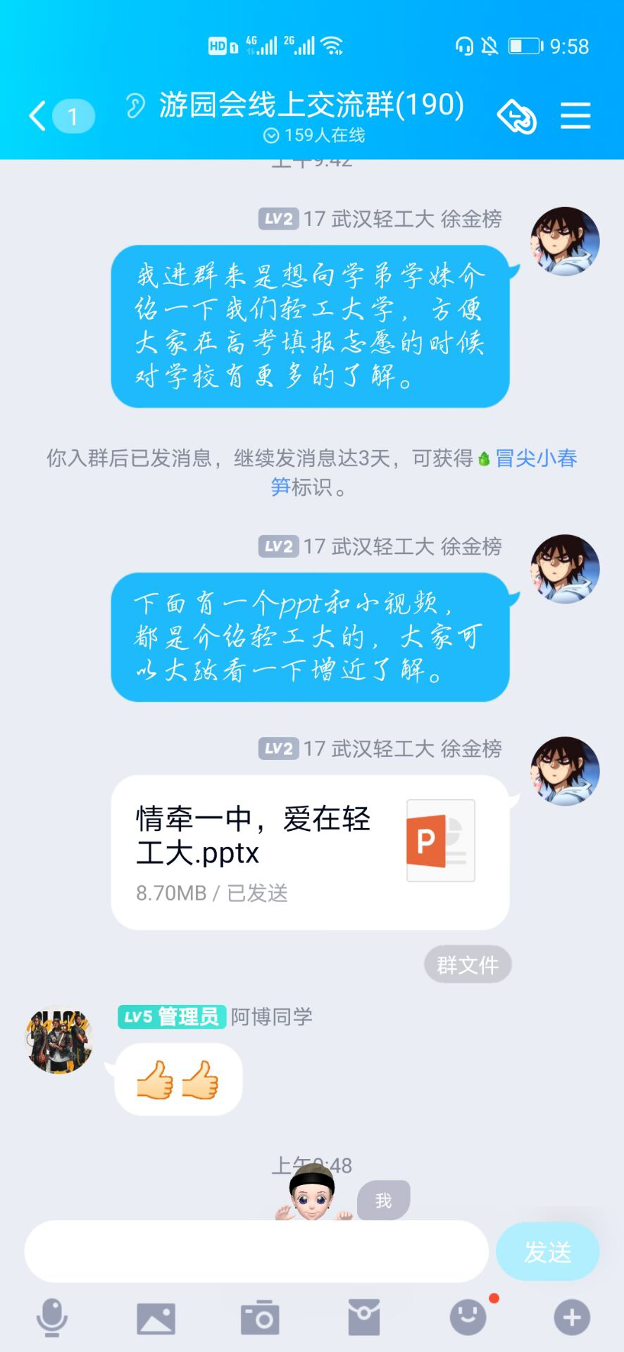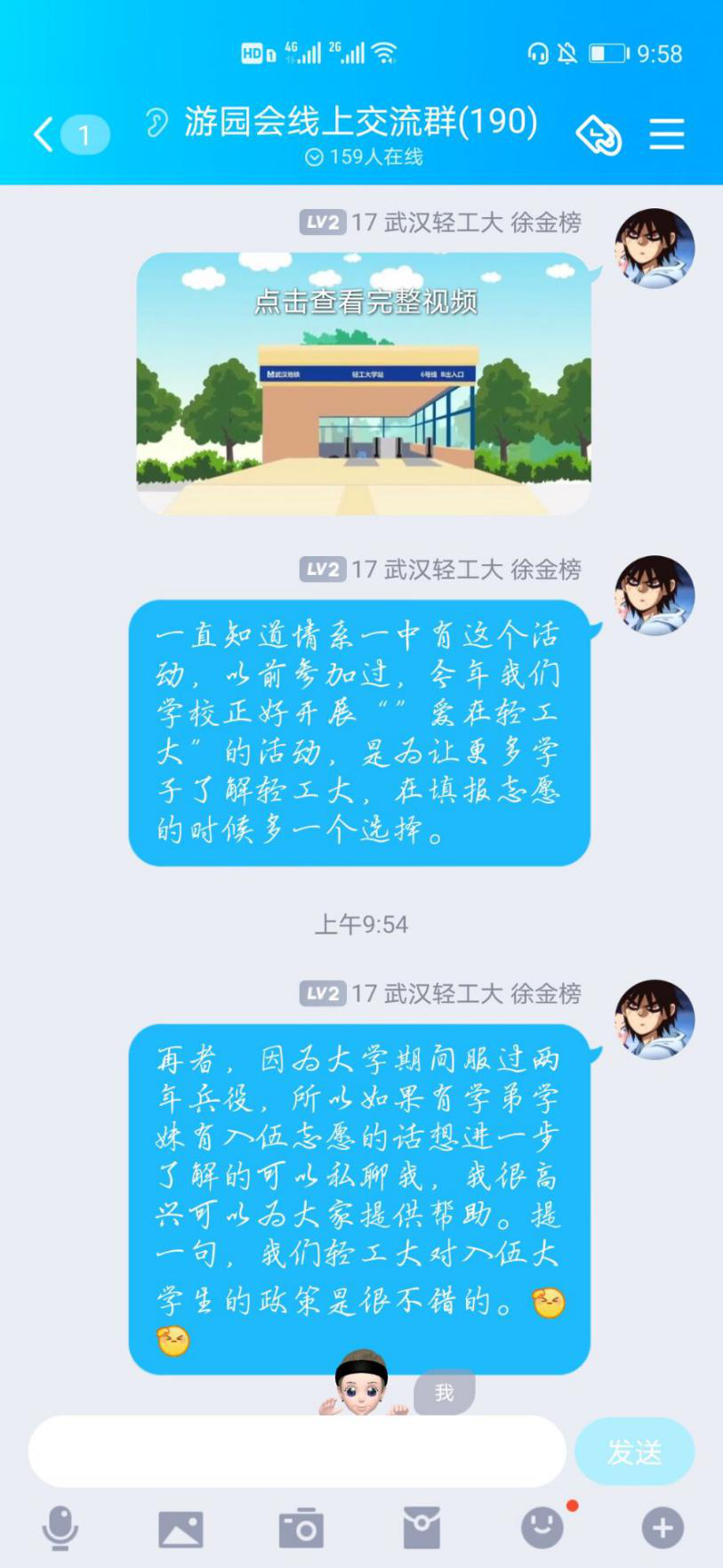 2月4日,我进入了英山一中游园会的线上交流群。此次游园会活动在增进一中学子对大学的了解,帮助其尽早树立考学目标上有着重要的意义。我将轻工大学的宣传资料发进群里,同时借助自己的参军经历,吸引到同学向我询问了解太阳成tyc9728集团.
