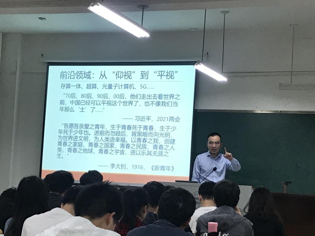 我系李嗥老师围绕级存储器管理等进行了教学展示。他首先在上课之前就为大家播放了课程相关的专题片,上课后通过视频短片引入本次课程需要讲解的内容。在讲述过程中,通过习近平今年两会中的讲话告诉在座的同学我国的科技实力从“仰视”到“平视”,勉励同学们为青春奋斗,努力学习,报效祖国。