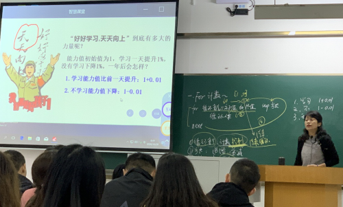 阮冰老师以毛泽东主席一句鼓励学生的话“好好学习,天天向上”为题,设计程序计算天天学习的力量。分析问题,学习一天能力值比前一天提升0.01,而不学习能力下降0.01。通过循环结构编程,求出每天坚持学习能力值达37.78,只有工作日学习能力值只有4.72,而不学习的能力值仅剩0.03。鲜明的数字对比震撼了大家的心灵,真切地感受到坚持每天学习的神奇力量。无需他言,学生们便能意识到只有克服困难、坚持天天学习才能成就最好的自己。一道编程题,既让学生学会如何使用循环结构解决问题,又为其求取上进的心指明了方向。这样的课程设计令人惊叹,打破了我们对思政课如坠云雾的遐想,原来课程思政课可以上得如此别有洞天。