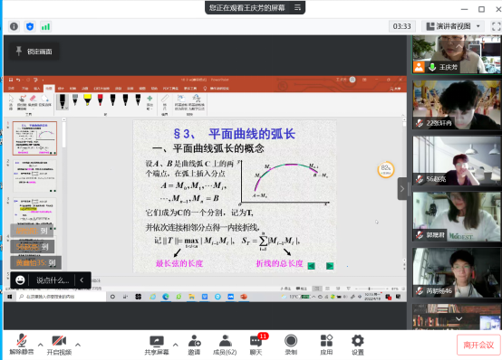 由于疫情原因,课程不得不采用在线上课的方式,但是同学们都非常认真,积极参与。本次课程,王庆芳老师介绍了《数学分析》中的平面弧长的概念和应用,利用折线代替曲线这一思想,结合具体的实例,按照由浅入深的学习规律,循序渐进,逐步引入直角坐标系下的计算公式,进而坐标变换,考虑在极坐标系上的计算方式,内容通俗易懂、重点突出。这个过程中,学生也体会了以直代曲、有限与无限、量变与质变、对立与统一的辩证思想,完成了曲线积分的重难点突破,也折射出人生智慧:将人生中每一个大目标分割成一个个具体的小目标,然后踏踏实实的去实现,这样坚持下去积少成多,终将实现大目标。对于中华民族的伟大复兴也是一样,需要全国人民齐心协力,终将完成伟大梦想。课堂上,同学们认真听讲,积极发言,并就具体问题的计算展开了讨论,如椭圆曲线的周长,心形线的周长等。