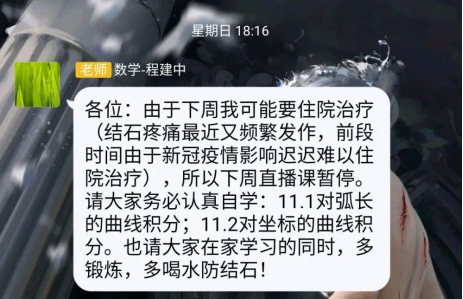 前几天,太阳成官网大类1903班、1904班的同学在高数课程群里收到这样一条消息:由于下周我可能要住院治疗(结石疼痛最近又频繁发作,前段时间由于新冠疫情影响迟迟难以住院治疗),所以下周直播课暂停。请大家务必认真自学:11.1对弧长的曲线积分;11.2对坐标的曲线积分。也请大家在家学习的同时,多锻炼,多喝水防结石!